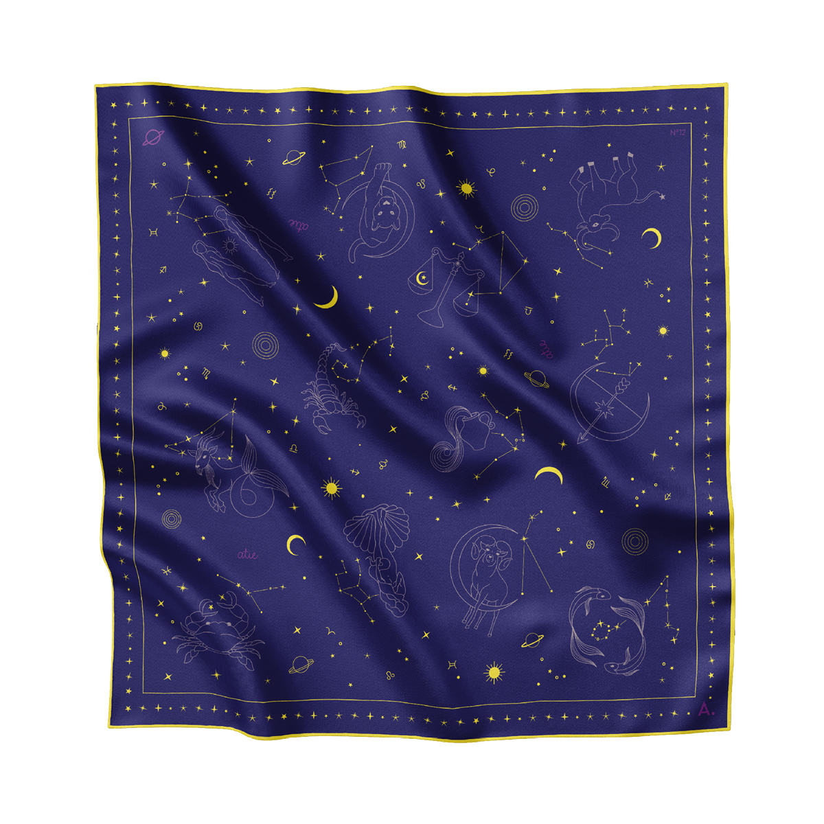 ASTRO N°12 erzählt von der Schönheit der Sterne und dem Zauber der Nacht, in der alles möglich scheint. Das tiefe Navy mit violettem Unterton trifft auf Akzente in Off-White, Gelb und Plum – ein Spiel aus Kontrasten, das sowohl bold als auch mystisch wirkt. Jedes Detail – von feinen Linien bis zu verborgenen Symbolen – macht ASTRO N°12 zu einem ganz besonderen Seidentuch.