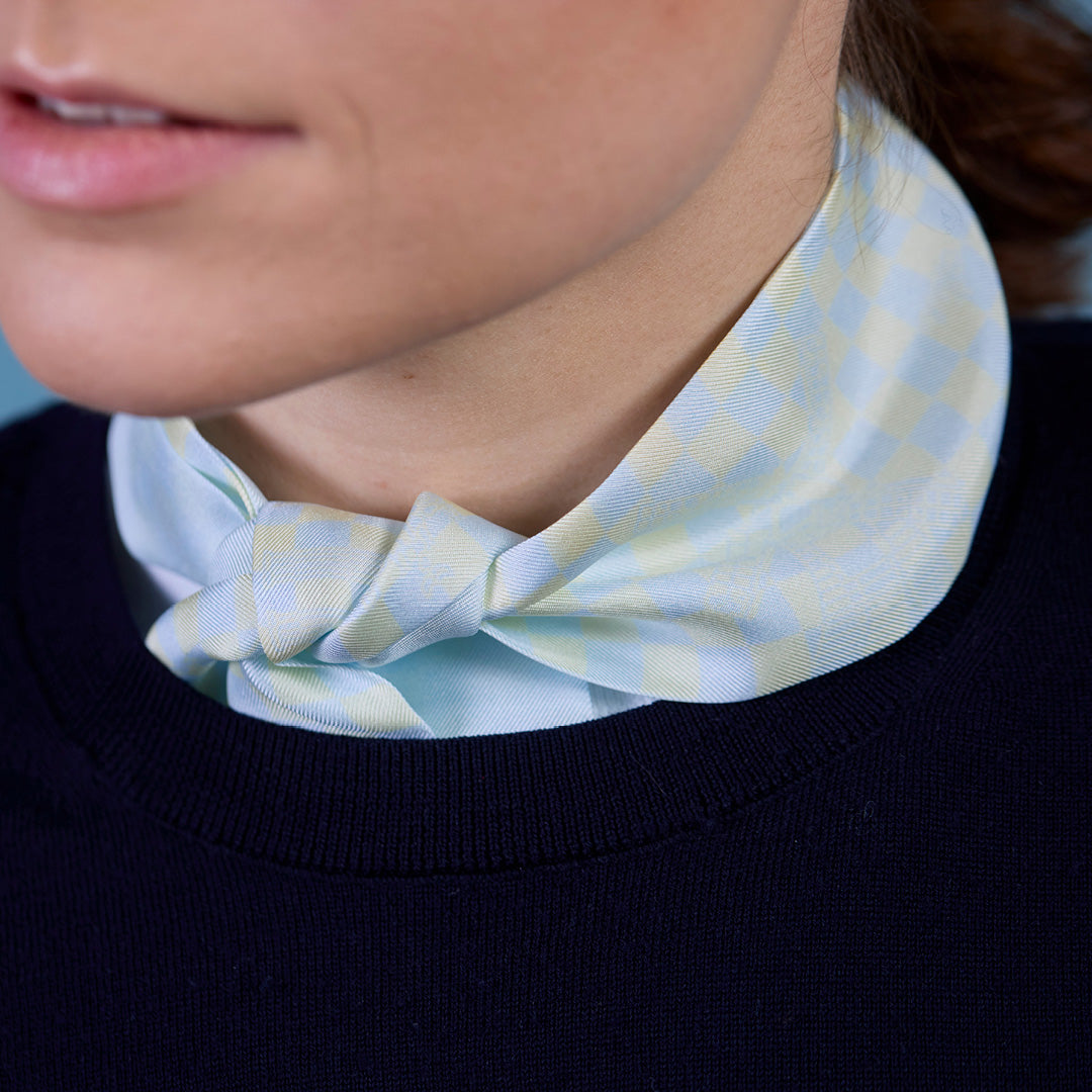 Twilly N°10 in Hellblau / Buttergelb bringt sommerliche Frische und grafische Klarheit zusammen. Das feine Karo in zwei der aktuell gefragtesten Trendfarben bildet die Bühne für handgezeichnete Wahrzeichen europäischer Städte – vom Eiffelturm bis zum Kolosseum. Die Rückseite bleibt bewusst einfarbig – für moderne Stylings mit ruhigem Finish. Die schlanke Form (7 x 90 cm) macht das Twilly zum idealen Sommer-Accessoire: tragbar als Haarband, Halstuch, Taschen-Detail oder Statement am Handgelenk.